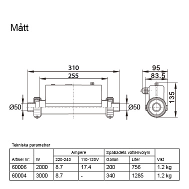 Värmare i rostfritt stål med inbyggd tryckvakt och kontrollkabel till extern styrbox.