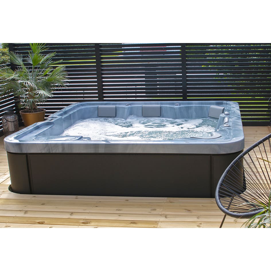This spa bath seats six, with a lovely section for lying down, and a corner seat providing neck massages and massage for the forearms, calves and feet. Three of the massage seats are controlled by a dual- speed pump. At the touch of a button, a soft massage beings, and at a second touch the massage streams become significantly more powerful. The soft massage is perfect for winding down after a powerful pummelling massage, or if the younger children want to swim without excessive massage streams.