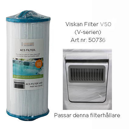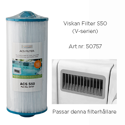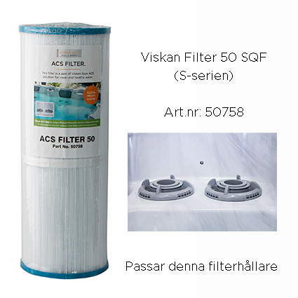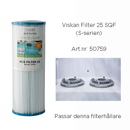 | Produkt | Viskan filter V50 med skruvgänga, Viskan filter S50 med skruvgänga, Viskan filter 25 SQF (sitter i spabadet vid köp), Viskan filter 50 SQF (ett tätare filter än det som medföljde spabadet vid köp) |
